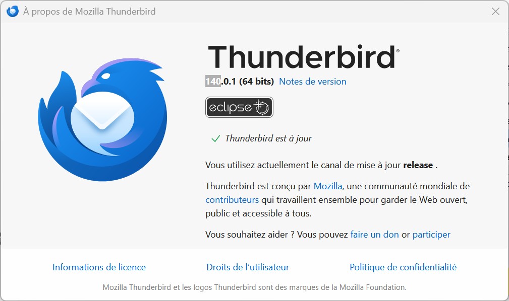 Thunderbird 140 « Eclipse » est dès à présent disponible sur Windows, macOS et Linux. Vous pouvez facilement mettre à jour via le menu « À propos » de Thunderbird, ou bien télécharger directement la version ESR sur thunderbird.net.