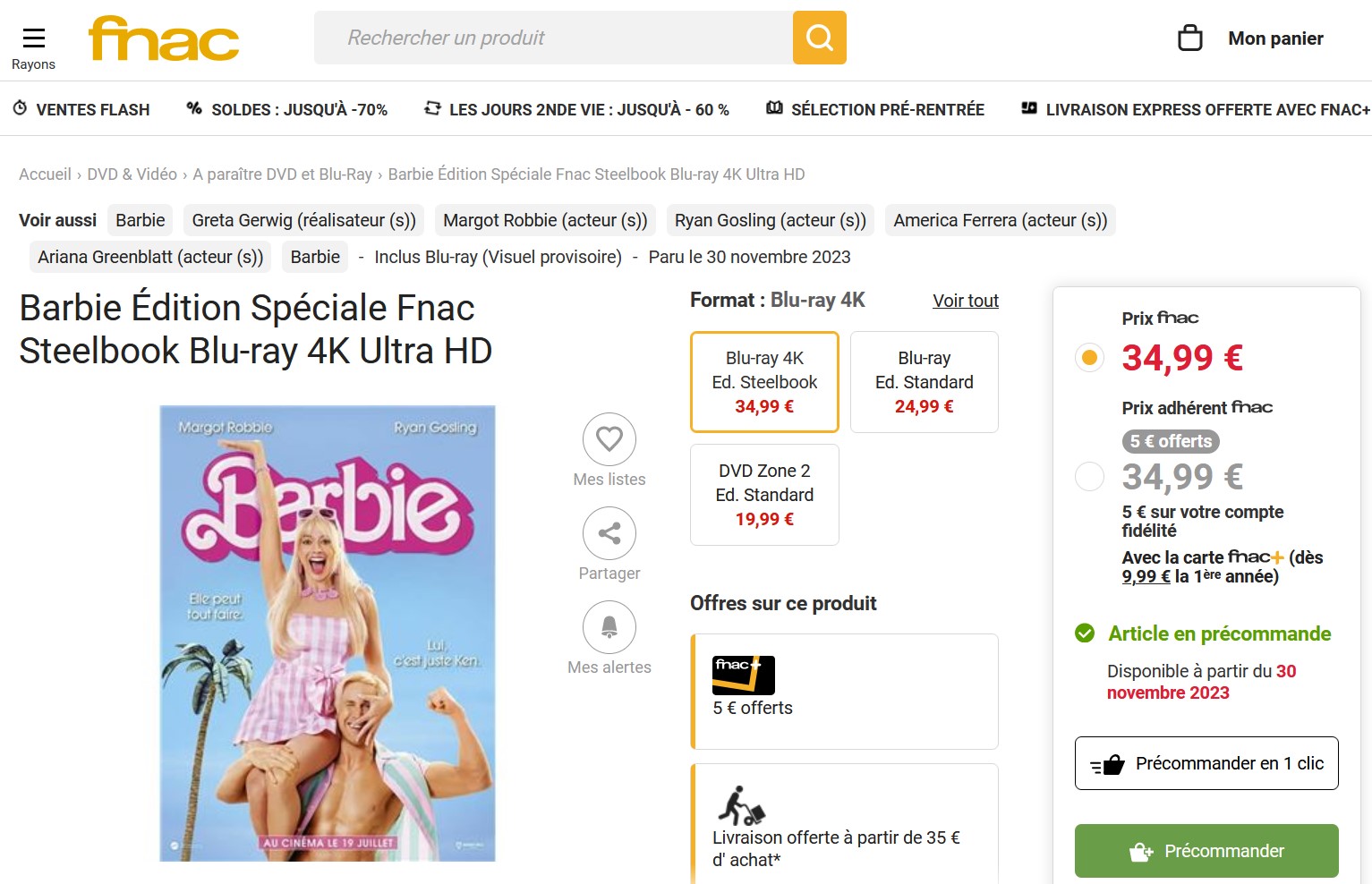Alors que l'annonce officielle de Warner, l'éditeur du film, est toujours en attente, Barbie a commencé à faire son apparition sur certains site de vente en ligne. C'est d'ailleurs le cas de la Fnac qui propose dès à présent sont édition Bluray 4K Steelbook à 34,49 €, de quoi ravir les collectionneurs et fans du films !