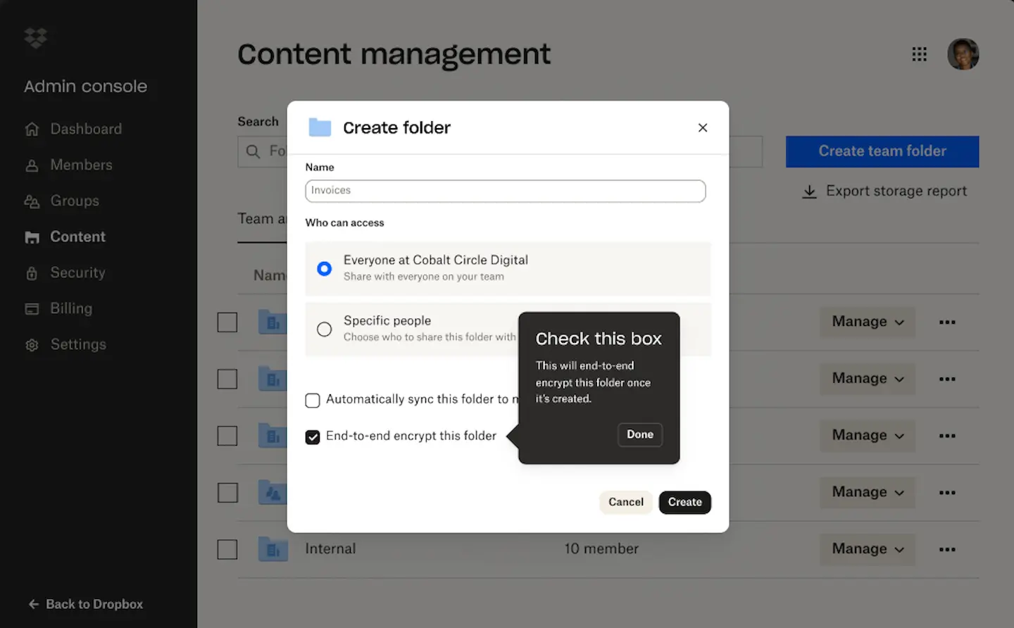 En outre, Dropbox a lancé une gestion avancée des clés de chiffrement, permettant aux utilisateurs de créer et gérer une clé de chiffrement unique via les services conformes aux normes FIPS 140-2 de niveau 3. Cette fonctionnalité est disponible pour les utilisateurs des plans Dropbox Advanced, Business Plus et Enterprise.