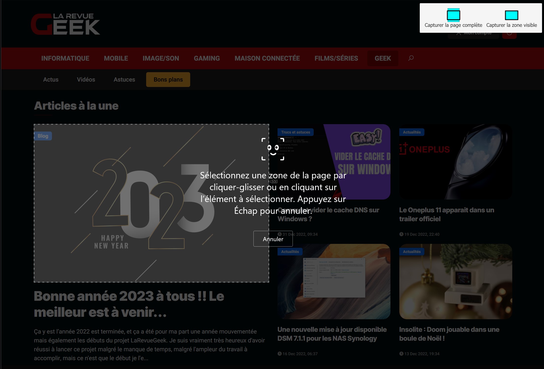 - Capturer la page complète : sélectionnez dans le menu situé en haut à droite.