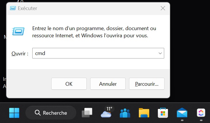 Ouvrez une invite de commandes en appuyant sur la touche Windows + R, puis en tapant "cmd" et en appuyant sur Entrée.
