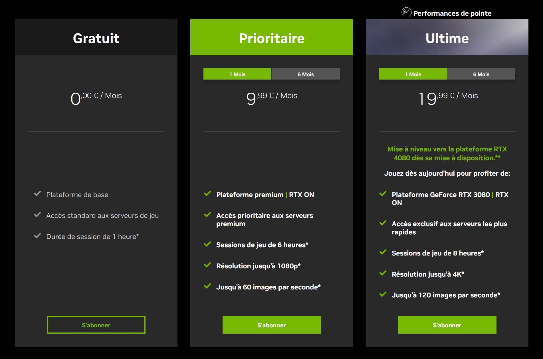 Votre choix devra donc se faire surtout en fonction de votre équipement et bien sûr de vos finances. Si vous comptez jouer sur un smartphone, une tablette ou un ordinateur portable, la formule prioritaire devrait suffire, puisqu'elle offre une résolution jusqu'en 1080p 60 Fps, généralement largement suffisant pour ce type d'équipement. Si vous êtes un joueur exigeant et que vous souhaitez jouer en 4k 60 Fps ou atteindre des framerates jusqu'à 120 Fps pour ceux qui ont des écrans gamers le permettant, la formule ultime, la plus onéreuse, est faite pour vous ! Sur ce plan, vous aurez tout simplement accès aux meilleures performances disponibles sur le marché, notamment grâce à la puissance des RTX 4080 intégrées à l'offre. Vous aurez également accès aux meilleurs serveurs, à des sessions de jeux plus longues, bref, tout ce qu'il vous faut pour vous offrir la meilleure expérience de cloud gaming.