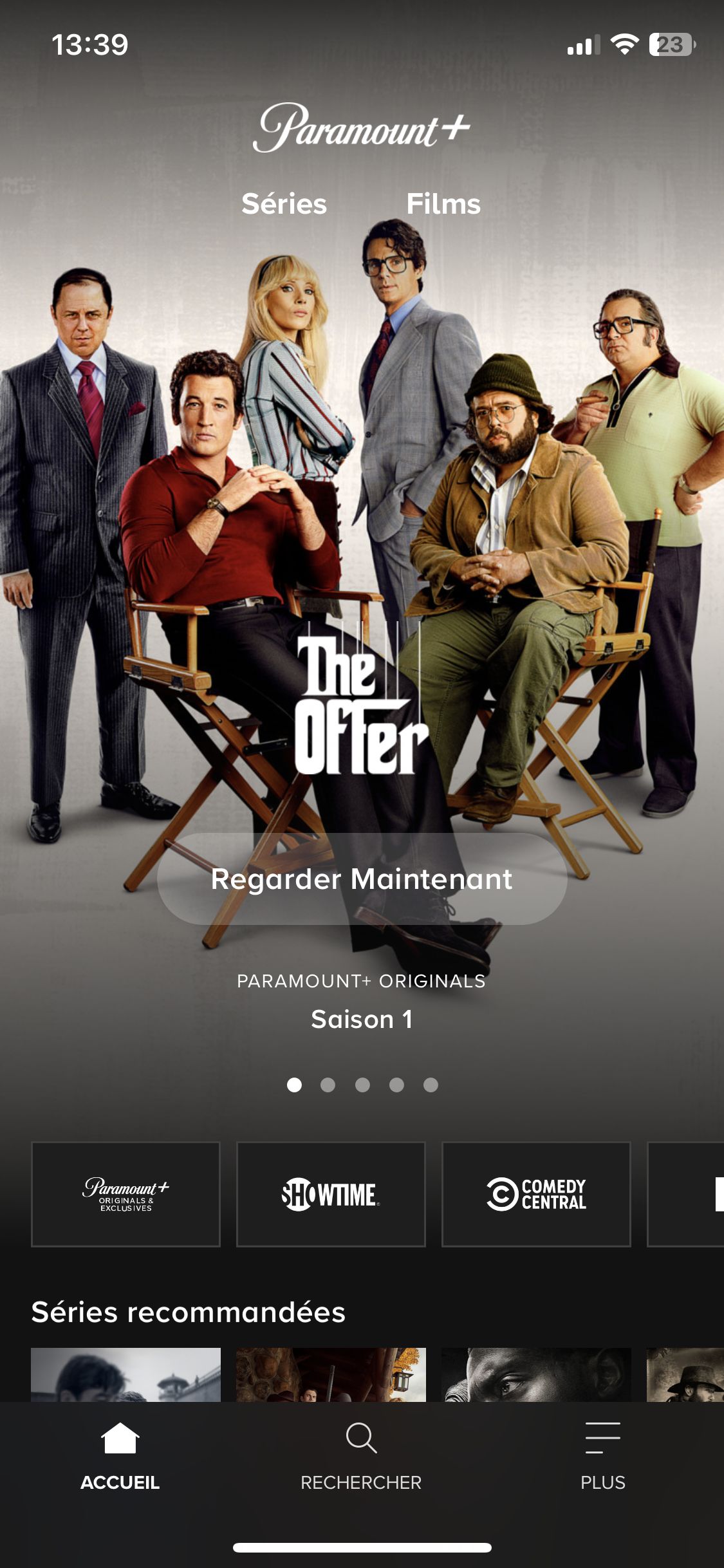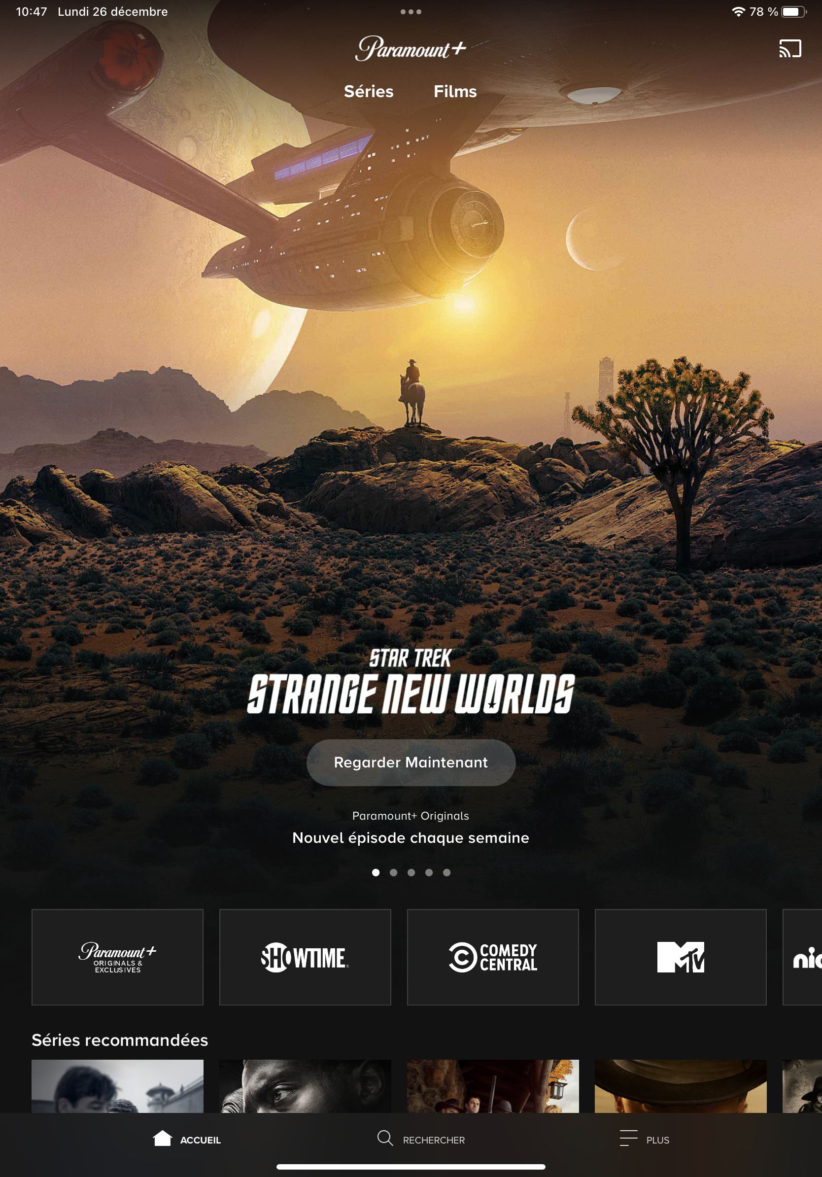 Sur l'écran d'accueil, on retrouve une sélection de contenus mis en avant par Paramount à l'aide de jolis visuels défilants, à l'image de Netflix. Visuellement c'est très réussi. On retrouve ensuite des filtres par studio façon Disney+ permettant d'accéder aux contenus correspondants.